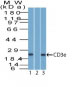 Western Blot of CD3e in human Jurkat cells (1) absence and (2) presence of immunizing peptide. (3) Mouse thymus probed with CD3e Rabbit Polyclonal Antibody. |