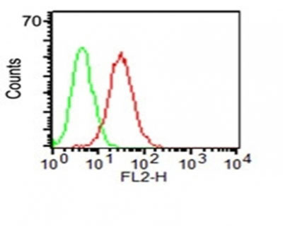 Flow Cytometry of KG-1 cells usin CD34 Monoclonal Antibody (ICO-115) (red) and isotype control (green). |