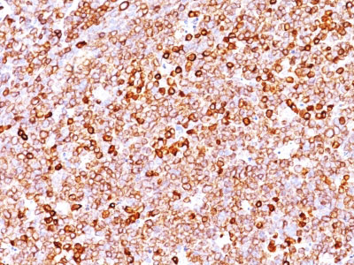 A disulphide-linked heterodimer, consisting of mb-1 (or CD79a) and B29 (or CD79b) polypeptides, is non-covalently associated with membrane-bound immunoglobulins on B cells. This complex of mb-1 and B29 polypeptides and immunoglobulin constitute the B cell Ag receptor. CD79a first appears at pre B cell stage, early in maturation, and persists until the plasma cell stage where it is found as an intracellular component. CD79a is found in the majority of acute leukemias of precursor B cell type, in B cell lines, B cell lymphomas, and in some myelomas. It is not present in myeloid or T cell lines. Anti-CD79a is generally used to complement anti-CD20 especially for mature B-cell lymphomas after treatment with Rituximab (anti-CD20). This antibody will stain many of the same lymphomas as anti-CD20, but also is more likely to stain B-lymphoblastic lymphoma/leukemia than is anti-CD20. Anti-CD79a also stains more cases of plasma cell myeloma and occasionally some types of endothelial cells as well.