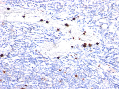 Formalin-fixed, paraffin-embedded human Tonsil stained with G-CSF Monoclonal Antibody (CSF3/900). Note specific cytoplasmic staining of granulocytes. |