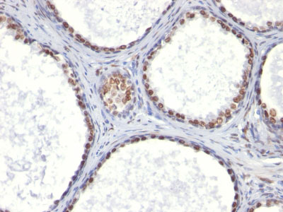 Recognizes a protein of 110kDa, which is identified as androgen receptor (AR). It reacts with full length, and the newly described A form of the receptor. It does not cross react with estrogen, progesterone, or glucocorticoid receptors. The expression of AR is reportedly inversely correlated with histologic grade i.e. well differentiated prostate tumors show higher expression than the poorly differentiated tumors. In prostate cancer, AR has been proposed, as a marker of hormone-responsiveness and thus it may be useful in identifying patients likely to benefit from anti-androgen therapy. Anti-androgen receptor has been useful clinically in differentiating morpheaform basal cell carcinoma (mBCC) from desmoplastic trichoepithelioma (DTE) in the skin.?This MAb is superb for staining of formalin/paraffin tissues.