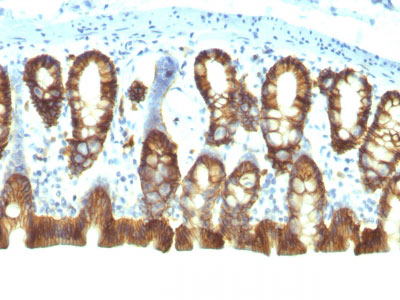 Formalin-fixed, paraffin-embedded Rat Colon stained with Ep-CAM Monoclonal Antibody (EGP40/1110). |