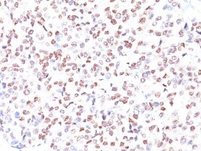 MITF (microphthalmia transcription factor) is a basic helix-loop-helix-leucine-zipper (bHLH-Zip) transcription factor that regulates the development and survival of melanocytes and retinal pigment epithelium, and also is involved in transcription of pigmentation enzyme genes such as tyrosinase TRP1 and TRP2. MITF has been shown to be phosphorylated by MAP kinase in response to c-kit activation, resulting in upregulation of MITF transcriptional activity. Mutations of the MITF gene are associated with the autosomal dominant hereditary deafness and pigmentation condition, Waardenburg Syndrome type 2A. Multiple isoforms of MITF exist, including MITF-A, MITF-B, MITF-C, MITF-H, and MITF-M, which differ in the amino-terminal domain and in their expression patterns. The MITF-M isoform is restricted to the melanocyte cell lineage. This MAb recognizes a nuclear protein, which is expressed in the majority of primary and metastatic epithelioid malignant melanomas as well as in normal melanocytes, benign nevi and dysplastic nevi.