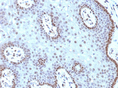 Formalin-fixed, paraffin-embedded human Cervical Carcinoma stained with c-myc Monoclonal Antibody (MYC909). |