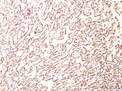 Formalin-fixed, paraffin-embedded human Angiosarcoma stained with Podocalyxin Monoclonal Antibody (4F10). |