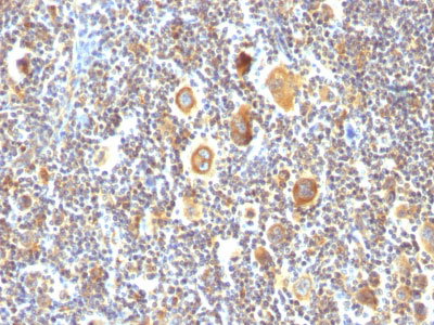 Recognizes a protein of 95kDa, which is identified as Bcl-6. Antibody to bcl-6 is helpful in a number of diagnostic settings: (1) In the differential diagnosis of small B-cell lymphoma. Follicular lymphoma will show bcl-6 (and CD10) positivity whereas other small B-cell lymphomas are usually negative. (2) Bcl-6 is an important prognostic marker in diffuse large B-cell lymphomas (DLBCL), where CD10, bcl-6 and MUM1/IRF4 are used to identify germinal center and activated B-cell phenotypes. (3) Bcl-6 can be valuable in distinguishing classical Hodgkin lymphoma from nodular lymphocyte predominant Hodgkin lymphoma (NLPHL). The Reed-Sternberg cells of classical Hodgkin lymphoma are bcl-6 negative whereas the large (?L&H?) cells of NLPHL are bcl-6 positive. In contrast, anti-Bcl-6 rarely stains mantle-cell lymphoma and MALT lymphoma.