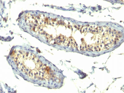 This antibody reacts with the TGF alpha and shows no cross-reaction with EGF and the neuropeptide synenkephalin. The staining with this MAb is completely blocked by the peptide used for raising this antibody. TGF? ? (aa50) is a growth factor with 33% homology to EGF, binds to EGFR, activates tyrosine phosphorylation of the receptor, and stimulates cell proliferation. It plays a role in tumor initiation by inducing the reversible transformed phenotype.