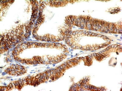 Formalin-fixed, paraffin-embedded human Colon Carcinoma stained with E-Cadherin Monoclonal Antibody (CDH1/1121).