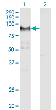 Western Blot analysis of ADAM12 expression in transfected 293T cell line by ADAM12 monoclonal antibody (M01), clone 1G3.Lane 1: ADAM12 transfected lysate (Predicted MW: 80.4 KDa).Lane 2: Non-transfected lysate.