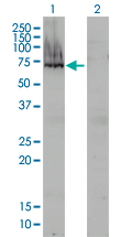 Western Blot analysis of AFP expression in transfected 293T cell line by AFP monoclonal antibody (M01), clone 1G7.Lane 1: AFP transfected lysate(69 KDa).Lane 2: Non-transfected lysate. |