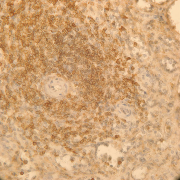 Immunoperoxidase of monoclonal antibody to AKAP13 on formalin-fixed paraffin-embedded human spleen. [antibody concentration 1.5 ug/ml] |
