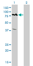 Western Blot analysis of ALS2CR8 expression in transfected 293T cell line by ALS2CR8 monoclonal antibody (M01), clone 2A3.Lane 1: ALS2CR8 transfected lysate(79.8 KDa).Lane 2: Non-transfected lysate. |