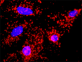 Proximity Ligation Analysis of protein-protein interactions between CDC20 and ANAPC11. HeLa cells were stained with anti-CDC20 rabbit purified polyclonal 1:1200 and anti-ANAPC11 mouse monoclonal antibody 1:50. Each red dot represents the detection of protein-protein interaction complex, and nuclei were counterstained with DAPI (blue). |