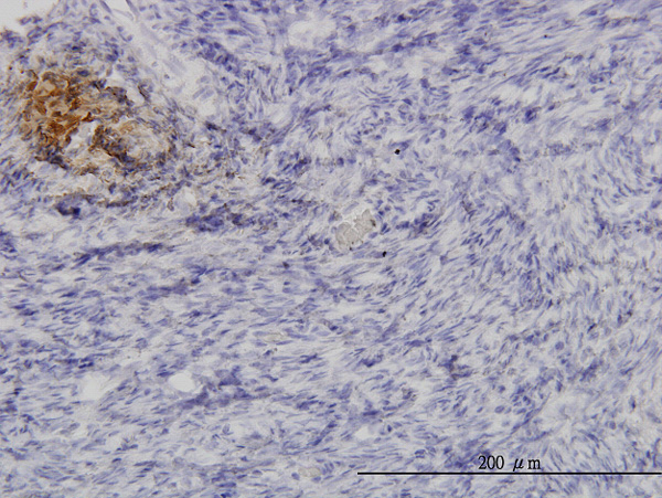 Immunoperoxidase of monoclonal antibody to ANGPTL1 on formalin-fixed paraffin-embedded human ovary. [antibody concentration 3 ug/ml] |