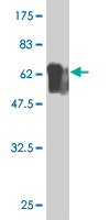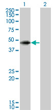 Western Blot analysis of ANGPTL5 expression in transfected 293T cell line by ANGPTL5 monoclonal antibody (M01), clone 1B2.Lane 1: ANGPTL5 transfected lysate(44.2 KDa).Lane 2: Non-transfected lysate. |