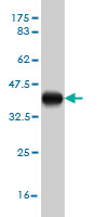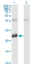 Western Blot analysis of ATF3 expression in transfected 293T cell line by ATF3 monoclonal antibody (M04), clone 8G5.Lane 1: ATF3 transfected lysate(20.6 KDa).Lane 2: Non-transfected lysate. |