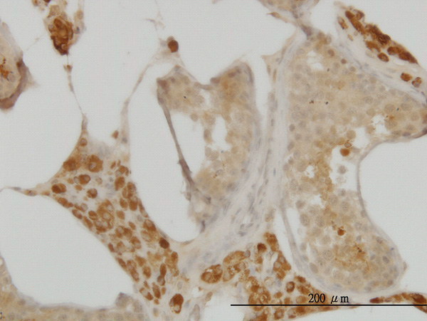 Immunoperoxidase of monoclonal antibody to C10orf7 on formalin-fixed paraffin-embedded human testis. [antibody concentration 3 ug/ml]