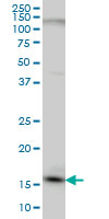 Western Blot analysis of C1D expression in transfected 293T cell line by C1D monoclonal antibody (M03), clone 6H2.Lane 1: C1D transfected lysate(16 KDa).Lane 2: Non-transfected lysate. |