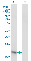 Western Blot analysis of C6orf115 expression in transfected 293T cell line by C6orf115 monoclonal antibody (M01), clone 1G12-1D7.Lane 1: C6orf115 transfected lysate(9.1 KDa).Lane 2: Non-transfected lysate.