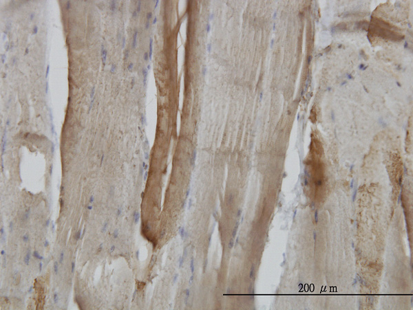 Immunoperoxidase of monoclonal antibody to CA3 on formalin-fixed paraffin-embedded human skeletal muscle. [antibody concentration 3 ug/ml] |