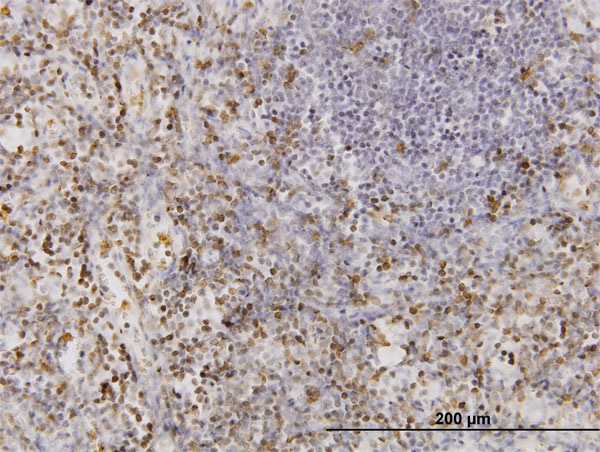 Immunoperoxidase of monoclonal antibody to CD177 on formalin-fixed paraffin-embedded human lymph node. [antibody concentration 3 ug/ml] |