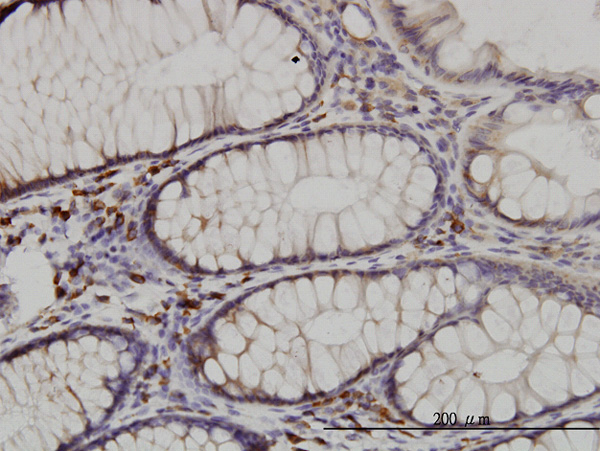 Immunoperoxidase of monoclonal antibody to CDK5RAP3 on formalin-fixed paraffin-embedded human colon. [antibody concentration 3 ug/ml] |