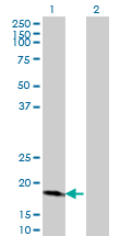Western Blot analysis of CDKN2D expression in transfected 293T cell line by CDKN2D monoclonal antibody (M08), clone 2E10.Lane 1: CDKN2D transfected lysate(17.7 KDa).Lane 2: Non-transfected lysate.