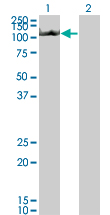Western Blot analysis of NLRP3 expression in transfected 293T cell line by NLRP3 monoclonal antibody (M01), clone 3B1.Lane 1: NLRP3 transfected lysate(118.2 KDa).Lane 2: Non-transfected lysate. |