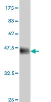 Western Blot analysis of CLK3 expression in transfected 293T cell line by CLK3 monoclonal antibody (M05), clone 1F10.Lane 1: CLK3 transfected lysate(58.6 KDa).Lane 2: Non-transfected lysate. |