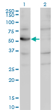 Western Blot analysis of CNDP2 expression in transfected 293T cell line by CNDP2 monoclonal antibody (M09), clone 1B1.Lane 1: CNDP2 transfected lysate(52.9 KDa).Lane 2: Non-transfected lysate.