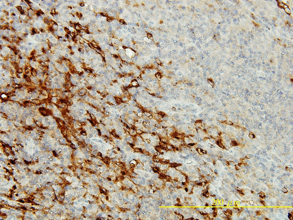 Immunoperoxidase of monoclonal antibody to CPVL on formalin-fixed paraffin-embedded human lymphomar tissue.[antibody concentration 2 ug/ml] |