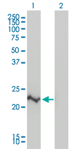 Western Blot analysis of CRADD expression in transfected 293T cell line by CRADD monoclonal antibody (M01), clone 1F8.Lane 1: CRADD transfected lysate(23 KDa).Lane 2: Non-transfected lysate. |