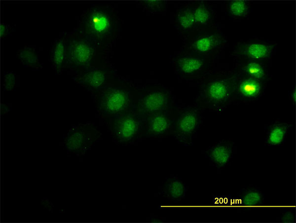 Immunofluorescence of monoclonal antibody to CSE1L on HeLa cell. [antibody concentration 25 ug/ml] |