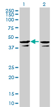 Western Blot analysis of CSNK2A1 expression in transfected 293T cell line by CSNK2A1 monoclonal antibody (M01), clone 3D9.Lane 1: CSNK2A1 transfected lysate(45.1 KDa).Lane 2: Non-transfected lysate. |