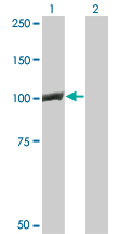 Western Blot analysis of CTNNB1 expression in transfected 293T cell line by CTNNB1 monoclonal antibody (M02), clone 1C9.Lane 1: CTNNB1 transfected lysate(85.5 KDa).Lane 2: Non-transfected lysate.