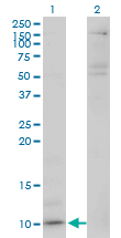 Western Blot analysis of CXCL5 expression in transfected 293T cell line by CXCL5 monoclonal antibody (M03), clone M1.Lane 1: CXCL5 transfected lysate(12 KDa).Lane 2: Non-transfected lysate.