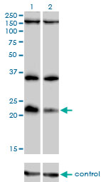 Western Blot analysis of DUSP22 expression in transfected 293T cell line by DUSP22 monoclonal antibody (M01), clone 3D3.Lane 1: DUSP22 transfected lysate(20.9 KDa).Lane 2: Non-transfected lysate.