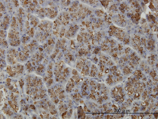 Immunoperoxidase of monoclonal antibody to ELA3A on formalin-fixed paraffin-embedded human pancreas. [antibody concentration 3 ug/ml] |