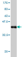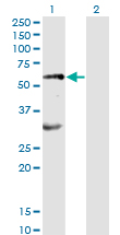 Western Blot analysis of EPOR expression in transfected 293T cell line by EPOR monoclonal antibody (M01), clone 3D10.Lane 1: EPOR transfected lysate (Predicted MW: 55.1 KDa).Lane 2: Non-transfected lysate. |