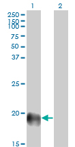 Western Blot analysis of ESM1 expression in transfected 293T cell line by ESM1 monoclonal antibody (M02), clone 6D4.Lane 1: ESM1 transfected lysate(20.1 KDa).Lane 2: Non-transfected lysate.