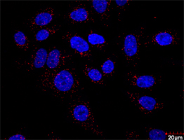 Proximity Ligation Analysis of protein-protein interactions between HSPB1 and F13A1. Huh7 cells were stained with anti-HSPB1 rabbit purified polyclonal 1:1200 and anti-F13A1 mouse monoclonal antibody 1:50. Each red dot represents the detection of protein-protein interaction complex, and nuclei were counterstained with DAPI (blue). |