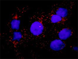 Proximity Ligation Analysis of protein-protein interactions between HSPB1 and F13A1 HeLa cells were stained with anti-HSPB1 rabbit purified polyclonal 1:100 and anti-F13A1 mouse monoclonal antibody 1:50. Each red dot represents the detection of protein-protein interaction complex, and nuclei were counterstained with DAPI (blue).