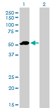 Western Blot analysis of F9 expression in transfected 293T cell line by F9 monoclonal antibody (M01), clone 2C9.Lane 1: F9 transfected lysate(51.8 KDa).Lane 2: Non-transfected lysate.