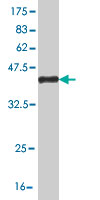 Western Blot analysis of FAIM3 expression in transfected 293T cell line by FAIM3 monoclonal antibody (M01), clone 1E4.Lane 1: FAIM3 transfected lysate(43.1 KDa).Lane 2: Non-transfected lysate. |