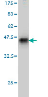 Western Blot analysis of FBLN1 expression in transfected 293T cell line by FBLN1 monoclonal antibody (M01), clone 4C9.Lane 1: FBLN1 transfected lysate(74.4 KDa).Lane 2: Non-transfected lysate. |