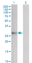 Western Blot analysis of FGF12 expression in transfected 293T cell line by FGF12 monoclonal antibody (M10), clone 1D9.Lane 1: FGF12 transfected lysate(27.4 KDa).Lane 2: Non-transfected lysate.