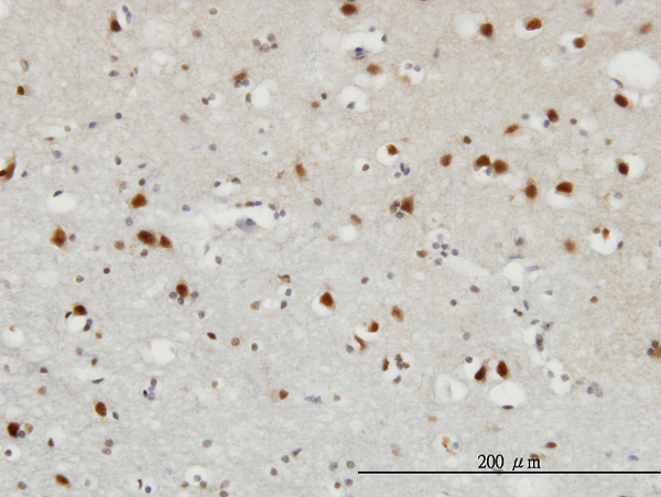 Immunoperoxidase of monoclonal antibody to FGF12 on formalin-fixed paraffin-embedded human cerebral cortex. [antibody concentration 3 ug/ml] |