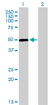 Western Blot analysis of ERCC6L expression in transfected 293T cell line by ERCC6L monoclonal antibody (M01), clone 3F12-2B10.Lane 1: ERCC6L transfected lysate(46.2 KDa).Lane 2: Non-transfected lysate.