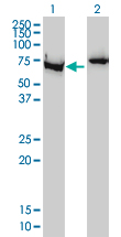 Western Blot analysis of XRCC6 expression in transfected 293T cell line by G22P1 monoclonal antibody (M01), clone 4C2-1A6.Lane 1: XRCC6 transfected lysate(70 KDa).Lane 2: Non-transfected lysate. |