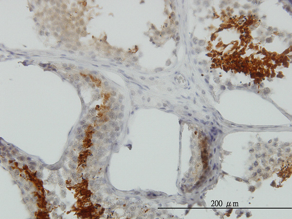Immunoperoxidase of monoclonal antibody to GAPDHS on formalin-fixed paraffin-embedded human testis. [antibody concentration 1.5 ug/ml] |